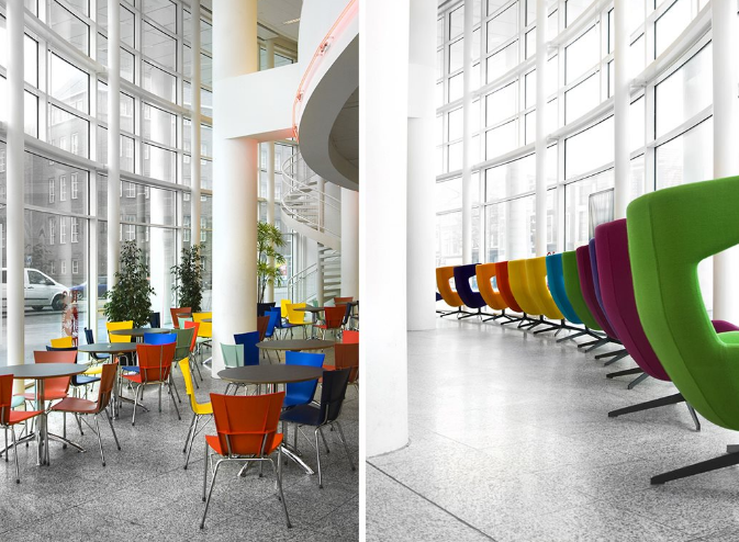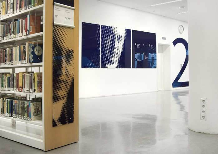 Біла архітектура, чисті лінії, внутрішній двір – все виглядає неймовірно сучасно та стильно. Ця чистота фасаду дозволяє робити такі проекти, як у 2017-му, до століття Піта Мондріана – характерний мондріанівський патерн прикрашав будівлю та задавав настрій весь минулий рік. За склом видніється масштабне кафе. Це нульовий поверх бібліотеки. Кафе із повноцінним меню та можливістю продовжити роботу або читання саме там.
