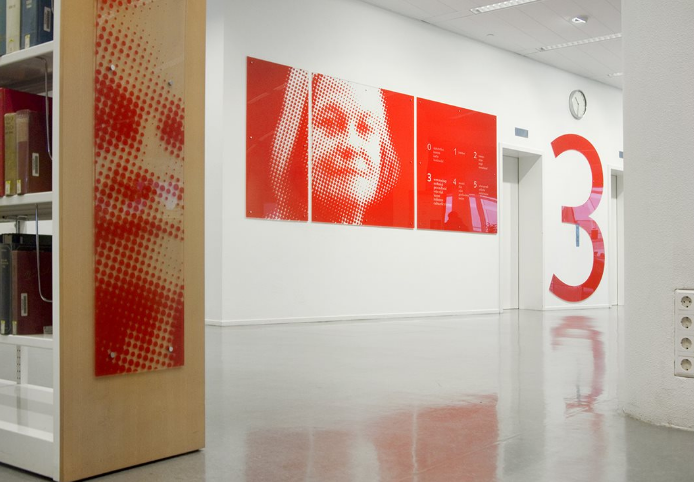 Далі айдентика. Червоне тло, біла літера В. Велика, занадто велика, але класно. Вона скрізь. Фірмовий стиль, який оточує тебе з фойє, далі буде супроводжувати на кожному поверсі й в кожному елементі дизайну: від інформаційного табло до паперового стаканчика, від екосумок до розділювачів на полицях.