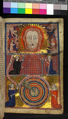 — В изображениях Земли самое поразительное — картины земного шара, словно видимого из космоса. Представьте себе миниатюру второй половины XV века, в которой планета Земля выглядит так, словно ее сфотографировали из околоземного пространства. С подобной силой фантазии средневекового миниатюриста могут сравниться лишь средневековые видения. Процитирую фрагмент видения Альпаиды из Кюдо: "Испытывая какое-то чудесное, неизъяснимое наслаждение от этого блаженного видения, она заметила далеко внизу, как будто в глубочайшей темной впадине, округлость земного шара и увидела Землю, всю словно обновленную, белоснежную, белеющую как мел..." Перед нами воображаемый полет в космическом пространстве, датируемый второй половиной XII века!