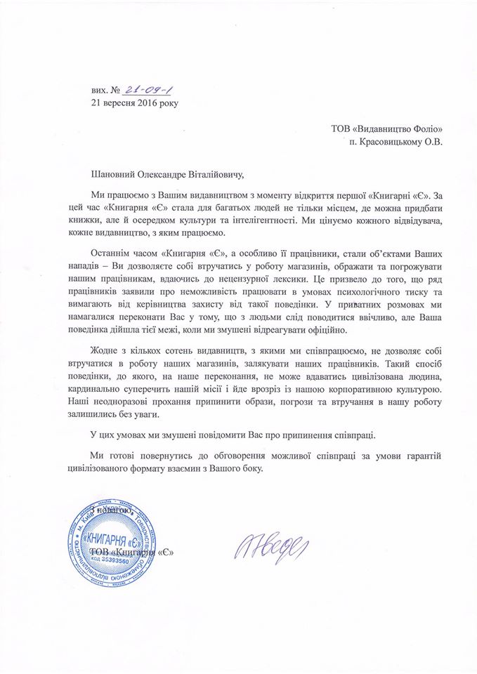 “Останнім часом поведінка власника видавництва Олександра Красовицького перейшла допустимі межі. Тероризування працівників – як менеджерів (офісу), так і консультантів і адміністраторів по різних наших книгарнях, моральний тиск, обзивання нецензурними словами, розлякування покупців – ми змушені були відреагувати на це офіційно, бо спроби вгамувати (з боку різних ланок керівництва) результату не мали. Будемо готові повернутися до співпраці, якщо вона буде супроводжуватись цивілізованою поведінкою”, – зазначила вона.