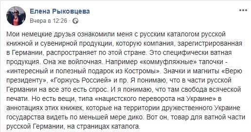 Журналістка зазначила, що це товари з каталогу російської книжкової та сувенірної продукції, яку компанія, зареєстрована в Німеччині, поширює по цій країні.
