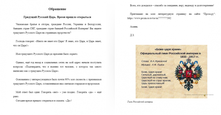 Правоохоронці встановили, що авторами електронного видання є один із мешканців Кропивницького та громадянин Росії, який видає себе за нащадка царської родини Романових. У тексті автори популяризують Російську Імперію та спростовують існування України як окремої суверенної держави.