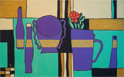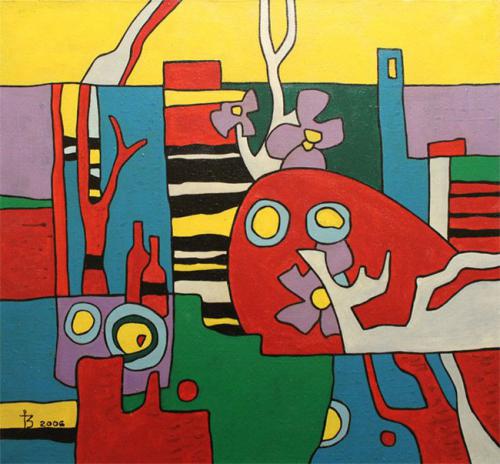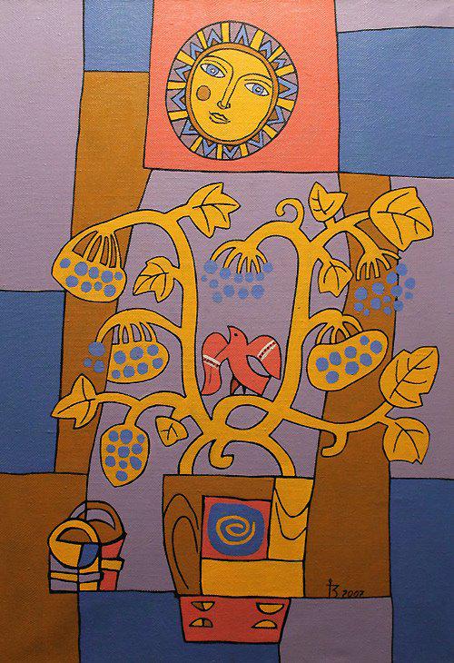 “Поліфонія кольорів у творах художника підтримується довершеністю, “зробленістю” та ритмічністю композиційної побудови. Його полотна – яскраві відкриття "… самого в собі, для себе" – і для людей”, – зазначає Валентина Грицук, – “На перший погляд – сконкретизовані кольорові площини (плями), але беззаперечно прочитується вплив сакральної орнаментики… У картинній площині перетинаються два світи – світлоносність гармонійних кольорів та конкретика предметного...”