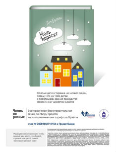Завдання проекту - зібрати мінімум 2 млн. грн. на видання шрифтом Брайля 4200 примірників художніх книг для дітей. Проект створений за ініціативою «Національної Асамблеї інвалідів України» (НАІУ) за підтримки Української Асоціації видавців періодичної преси (УАВПП). Творчий і комунікаційний супровід проекту здійснює група агентств маркетингових сервісів Talan Group.