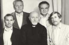Володимир Лучук (сидить крайній справа) і Лібор Коваль (сидить посередині). Львів, 1991 рік.