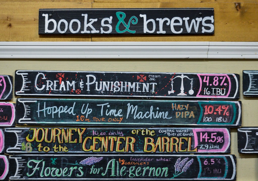 У Books & Brews поряд із книжковими стелажами розташовані дерев’яні столи, столики для настільних ігр та барна стійка.