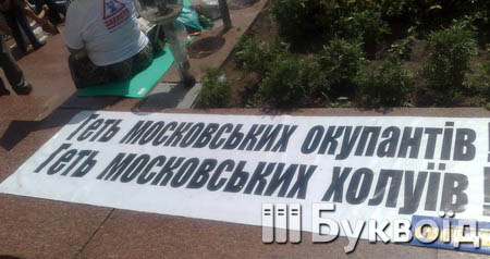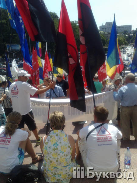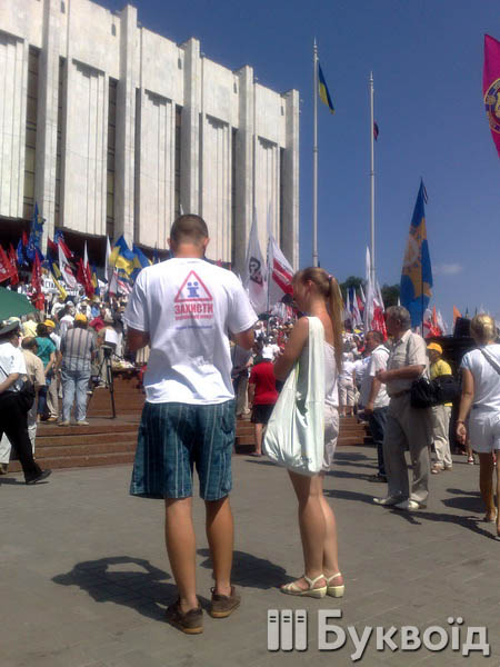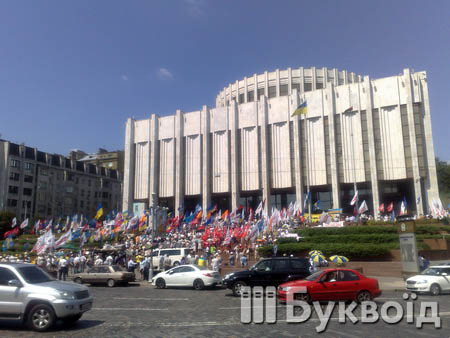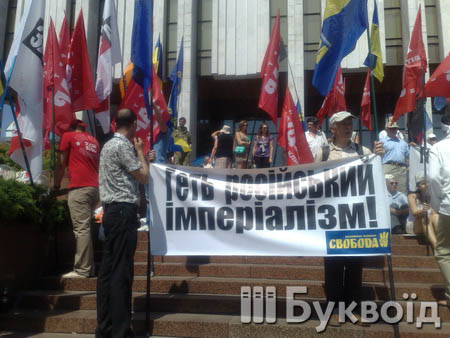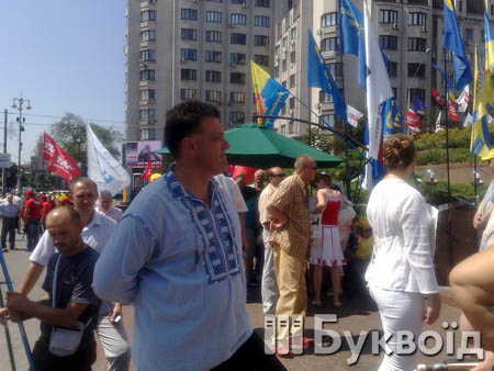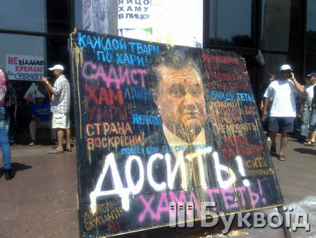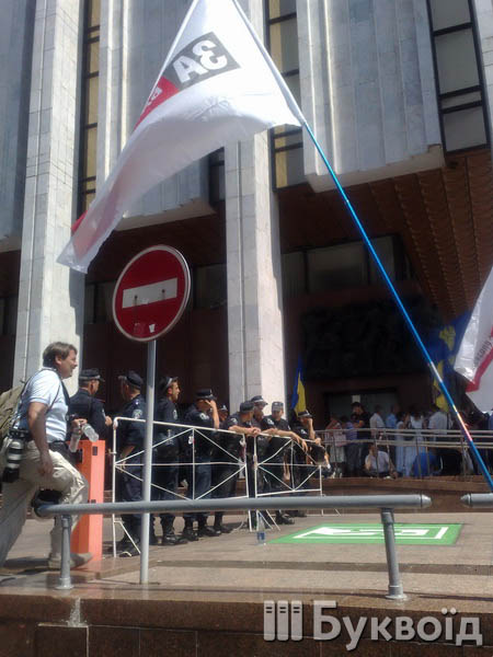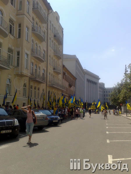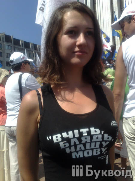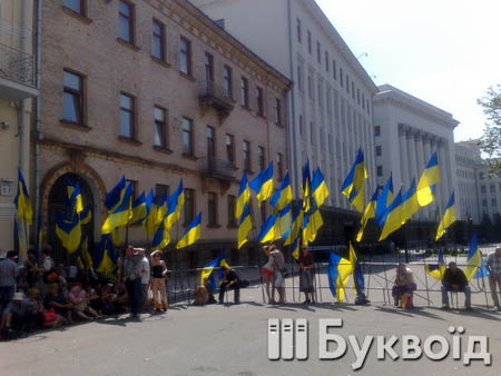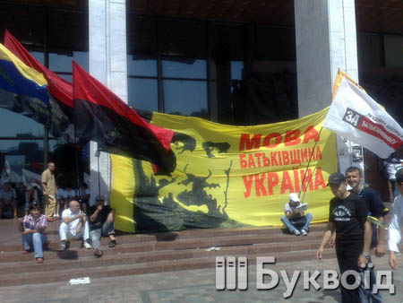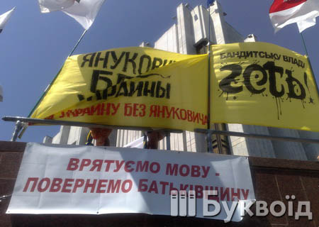 А тим часом біля Адміністрації президента люди під синьо-жовтими прапорами вимагали від Віктора Януковича завізувати "мовний" закон.