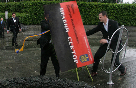 У репортажі журналістів стверджувалося, що в "спалених бойовиками автомобілях проросійських громадян Слов´янська", крім зброї та доларів, були знайдені візитки лідера "Правого сектора", кандидата в президенти України Дмитра Яроша.