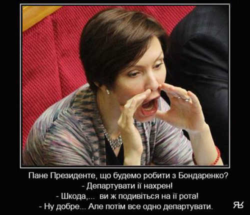 3 липня під час виступу Петра Порошенка у Верховній Раді народний депутат від Партії регіонів Олена Бондаренко намагалася перекричати голову держави, розповідаючи про "звірства" українських військових. У відповідь Порошенко грюкнув кулаком. Бондаренко одразу ж стале героїнею численних фотожаб у мережі.