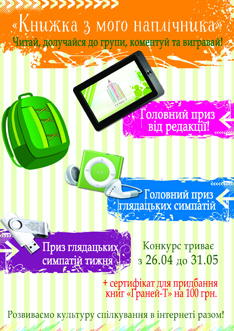 З 26 квітня до 31 травня всі охочі юні читачі мають розмістити у групі vk.com/grani_t свої враження про книжки «Граней-Т». Переможці конкурсу визначатимуться за кількістю лайків, коментарів та за рішенням редакції.