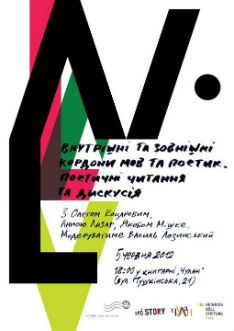 5 червня о 18.00 у київській книгарні «Чулан» (вул. Пушкінська, 21) відбудуться поетичні читання та дискусія «Внутрішні та зовнішні кордони мов та поетик».