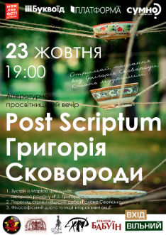 23 жовтняо 19.00 в букарні «Бабуїн» (вул. Симона Петлюри, 10) відбудеться літературно-просвітницький вечір присвячений постаті українського просвітителя-гуманіста, філософа, поета та педагога - Григорія Сковороди.