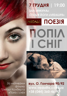 7 грудня о 19.00 у залі «Ямуна» студії йоги «Vedalife» (вул. О. Гончара 90/92,поряд із цирком і театром «Браво») відбудеться вечір поезії Мідної «Попіл і сніг» за мотивами однойменного фільму Грегорі Колберта – символу краси у мовчанні і нерухомості, тиші і зосередженості, благословенного єднання із величезним живим створінням – планетою Земля.