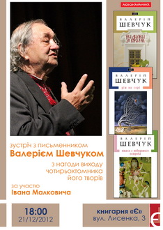 21 грудня о 18.00 у Книгарні «Є» (Київ, вул. Лисенка, 3) відбудеться зустріч з письменником Валерієм Шевчуком з нагоди виходу чотирьохтомника його творів.