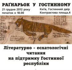 21 ãðóäíÿ î 18.00 ó Ãîñòèííîìó äâîð³ (Êîíòðàêòîâà ïëîùà, 4) â³äáóäóòüñÿ ë³òåðàòóðí³-åñõàòîëîã³÷í³ ÷èòàííÿ íà ï³äòðèìêó Ãîñòèííî¿ ðåñïóáë³êè.