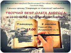 8 лютого о 19.00 у мистецько-громадському центрі в Гостиному дворі (Контрактова площа, 4) у рамках циклу «Література по пʼятницях» відбудеться літературний вечір Олега Андроса