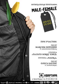 О 19.00 вечір продовжить літературно-музична програма «MALE-FEMALE», яку складуть виступи гуртів «NaoKa», «Пальто Sorry Бэнд» і запорізького поета Олеся Барліга.