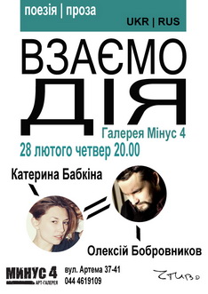28 лютого о 20.00 у столичній галереї «Мінус 4») (вул. Артема 37-41) відбудеться літературний вечір «Взаємодія» за участю Катерини Бабкіної та Олексія Бобровникова.