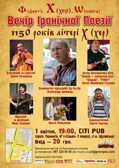 - Святкувати та обирати херувима (серед присутніх) поети будуть під час "Вечора Іронічної Поезії "1150 років літері Х (хер)", який відбудеться в особливий день - День сміху - 1 квітня о 19:00 в Citi Pub (просп. Перемоги, 47).