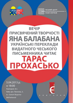 5 квітня о 18.00 Чеський центр у Києві та Книгарня «Є» запрошують вас послухати прозу Яна Балабана у виконанні Тараса Прохаська. Захід відбуватиметься у циклі зустрічей «Ukrajinci – čtěte».