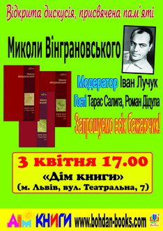 3 квітня о 17.00 у львівській книгарні «Дім книги» (вул. Театральна, 7) відбудеться відкрита літературознавча дискусія, присвячена пам’яті поета Миколи Вінграновського.