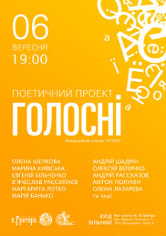 6 вересня з 19.00 до 20.30 у Арт-центрі імені Я. Гретера (вул. Вадима Гетьмана, 6, ТРЦ «Більшовик», блок А, 3-7 поверх) відбудуться поетичні читання проекту «Голосні».