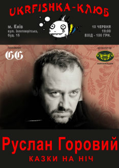 10 червня, о 19.00, у «Голден Гейт пабі» (вул. Золотоворітська, 15), режисер, журналіст, письменник, волонтер Руслан Горовий в гостях у UkRFIshka читатиме свої «Казки на ніч» з однойменних Facebook-проекту та книги «Казки на ніч. Те, що боліло протягом року», яку анонсувало видавництво «Кальварія» і готує до видання на початок осені.