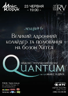 23 червня, о 19.00, у ляльковому театрі Рівного (вул. С.Петлюри, 5), відбудеться чергова зустріч проекту «Quantum». Тема шостої лекції: «Великий адронний колайдер та полювання на бозон Хіггса».