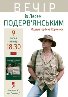 9 липня, четвер, о18:30 в Книгарні «Є» (вул. Лисенка, 3, Київ) ви зможете не тільки отримати автограф найцитованішого українського митця Леся Подерв’янського, взяти участь у презентації повного зібрання його творів «Африка, сни» (Наш Формат, 2015), а й дістати справжнє задоволення від відвертоїрозмови.