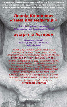 Леонід Кононович не часто з’являється на публіці, тому зустріч дає рідкісну можливість разом із письменником знайти та відчути свою грань «Теми для медитації», яку в одному з найсвіжіших літоглядів охарактеризовано наступним чином: