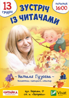 13 грудня, о 16.00, в книжковому магазині «Читайка» (вул. Вербова 17, 100 метрів від метро «Петрівка») відбудеться зустріч із класиком дитячої літератури, творцем «Капітошки» та «Петрика П’яточкіна», Наталею Гузєєвою.