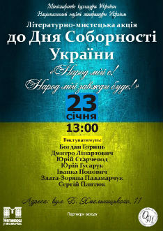 23 січня 2016 року о 13.00 у Національному музеї літератури України (вул. Б. Хмельницького, 11) відбудеться літературно-мистецький акція до Дня Соборності України «Народ мій є! Народ мій завжди буде!».