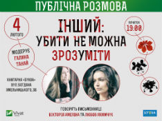 4 лютого, о 19.00, в книгарні «Буква» (вул. Богдана Хмельницького 3Б) відбудеться публічна розмова «Інший: зрозуміти не можна вбити» з письменницями Вікторією Амеліною та Любов’ю Якимчук.