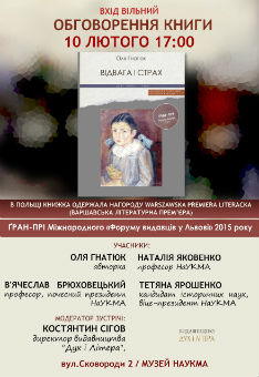 10 лютого о год. 17.00 в Музеї НаУКМА, вул. Сковороди 2 (вхід з боку Староакадемічного корпусу) відбудеться обговорення книжки професора НаУКМА, відомої дослідниці Олі Гнатюк «Відвага і страх».