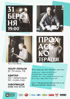 Це буде вже традиційний для Рівного сеанс «терапії» від франківського письменника. Організатори, які ще минулого року назвали захід «Прохаськотерапією», обіцяють натхненну зустріч із сучасним Сковородою. Формат вечору передбачає розмови із письменником про актуальний стан речей у світі та в країні, обговорення літературних новинок від пана Тараса та вирішення найбільш болючих питань з допомогою читання «затишних» текстів. Також глядачі зможуть почути уривки із книг Тараса Прохаська. Захід пройде у ляльковому театрі Рівного. Модератор – Олена Шульга.