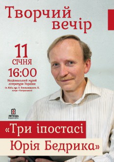 Видавництво «Легенда» і Національний музей літератури України запрошують вас на творчий вечір Юрія Бедрика до його 50-річчя, який відбудеться 11 січня о 16:00 у приміщенні музею (м. Київ, вул. Б. Хмельницького, 11, метро «Театральна»).