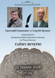 25 травня о 17.00 у Будинку письменників (вул. Банкова, 2) відбудеться творчий вечір Григорія Іваненка та Сергія Цушка «Тайна вечеря».