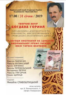 31 січня о 17:00 год. Національний музей літератури спільно звидавництвом «Ярославів Вал»запрошують на творчий вечір відомого письменника-документаліста, публіциста, мистецтвознавця і громадсько-політичного діяча Богдана Гориня з нагоди висунення його на здобуття Національної премії України імені Тараса Шевченка.