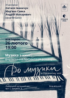 Музика з книг – неочікуванийформат представлення прози, який допоможе розкрити глядачам особливу атмосферу роману «До музики». Чуттєві розмови про книгу з перекладачкою Наталею Іваничук та модератором Мар’яною Савкою в поєднанні з музичними етюдами Кетіля Бйорнстада та живим фортепіанним виконанням творів, які неодноразово зринають на сторінках роману - цей літературно-музичний вечір однозначно зачарує вас. Тож запрошуємо усіх любителів якісної прози та класичної музики 26 лютого о 19.00 до Львівського органного залу (вул. Степана Бандери, 8). Вхід вільний.