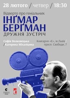 28 лютого у львівській Книгарні "Є" (просп. Свободи, 7) перекладачка Софія Волковецька та письменниця Катерина Міхаліцина говоритимуть "відверто про геніальних" - про Берґмана - та презентуватимуть український переклад його книги "Laterna Magica". Початок о 18:30. Вхід вільний.
