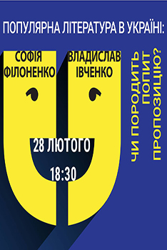 28 лютого о 18:30 в Книгарні «Є» професорка, літературна критикиня Софія Філоненко та письменник Івченко Владислав говоритимуть про успіхи й невдачі масліту в Україні. Про «хвороби росту», актуальні тренди і перспективи. Дискутуватимуть, чи може український масліт витримати конкуренцію із зарубіжним, а також із кіно, коміксами та комп’ютерними іграми. Розглянуть жанрові кордони та імідж популярної літератури. Говоритимуть про авторів, які намагаються поєднувати «високу полицю» та популярні тексти. І поміркують, що популярна література може розповісти світові про Україну та українців.