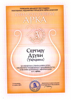 У 2017-му лауреатами «Арки» стали поети з України – Тетяна та Сергій Дзюби. Їхня ошатна, чудова книжка «На острові, далекому, мов сльози Єви» сербською та українською мовами побачила світ у видавництві «Арка» торік. Вірші знаних українців блискуче переклав видатний сербський письменник, академік Рісто Василевскі. А цікаву, проникливу передмову до книги написав відомий поет, перекладач, головний редактор популярної газети «Књижевне новине» (сербської літературної газети), доктор філологічних наук, професор Мічо Цв’єтіч.