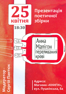 25 квітня о 18.30 у магазині «Книги», що на Пушкінській 8, Анна Малігон читатиме вірші зі своєї нової збірки «Переливання крові».