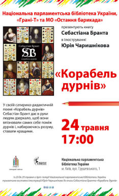 24 травня в Національній парламентській бібліотеці України «Грані-Т» та мистецьке об’єднання «ОстаNNя барикада» презентують подарункове видання поеми німецького сатирика XV століття Себастіана Бранта «Корабель дурнів».