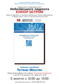 5 жовтня з 12.00 до 13.00 в рамках «Книжкового Арсеналу» вул. Лаврська,10-12.зал №2) відбудеться презентація книги Нобелевського лауреата Елінор Остром «Керування спільним. Еволюція інституцій колективної дії», що переклала з англійської Тетяна Монтян.