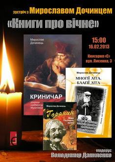Книгарня «Є» та видавництво «Карпатська вежа» запрошують на авторську зустріч з Мирославом Дочинцем “Книги про вічне”, яка відбудеться 16 лютого.