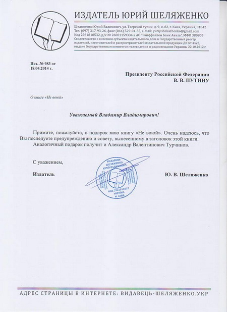 18 квітня 2014 року о 15 годині видавець Юрій Шеляженко передасть у подарунок президенту Россії В. Путіну через посольство РФ в Україні (Київ, Воздухофлотский пр-т, 27) антивоєнну книгу під назвою "Не воюй".