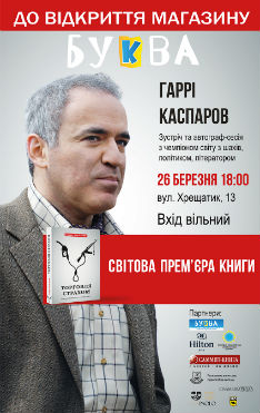 26 березня політик, шахматист та літератор Гаррі Каспаров презентує свою першу політичну книгу «Торгівля страхом» на урочистому відкритті нового магазину книжкової мережі «Буква» (вул. Хрещатик, 13).