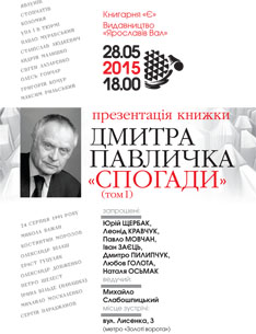 28 травня, о 18.00, у книгарні «Є» (вул. Лисенка, 3) відбудеться презентація документально-публіцистичної книжки Дмитра Павличка «Спогади» (том І), що побачила світ у видавництві «Ярославів Вал».