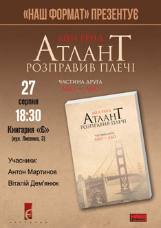 Видавництво «Наш Формат» та книгарня «Є» запрошують на презентацію першої та другої частин трилогії Айн Ренд «Атлант розправив плечі» - 27 серпня, 18:30, книгарня «Є» (вул. Лисенка, 3).